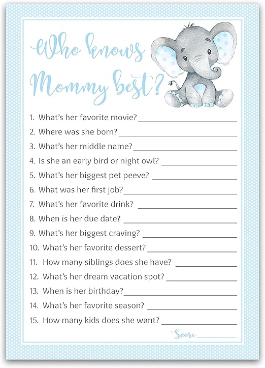 Amazon Com Blue Elephant Baby Shower Games Who Knows Mommy Best Pack Of 25 Boy Baby Shower Game New Parent Couples Coed Sprinkle Fun Guessing Game Shower Activity Questions Mom To Be Polka